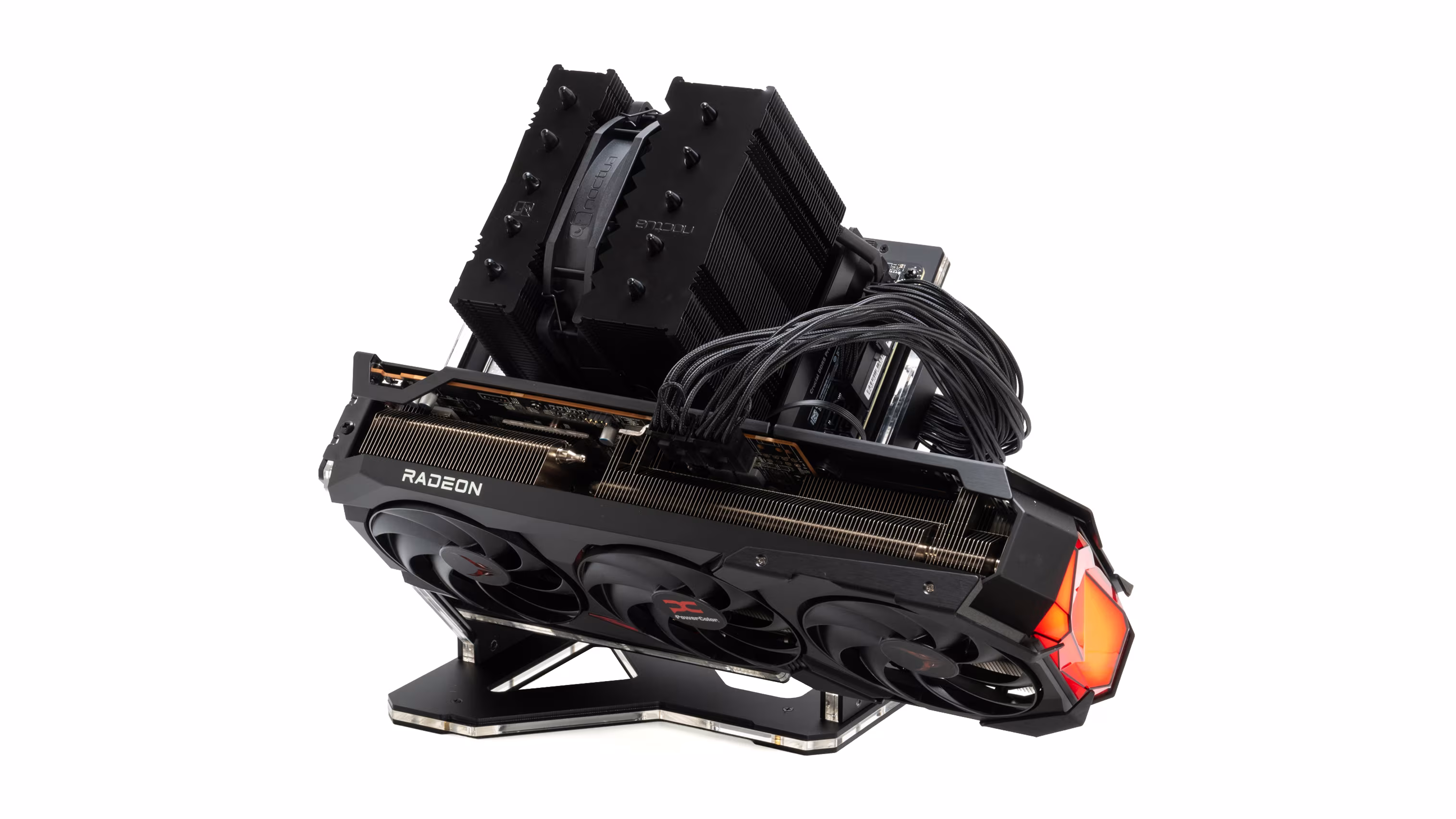 オープンフレームなのでCPUクーラーやグラフィックボードのサイズに制限はありません。SSDのやケースファンもつけられないです。
