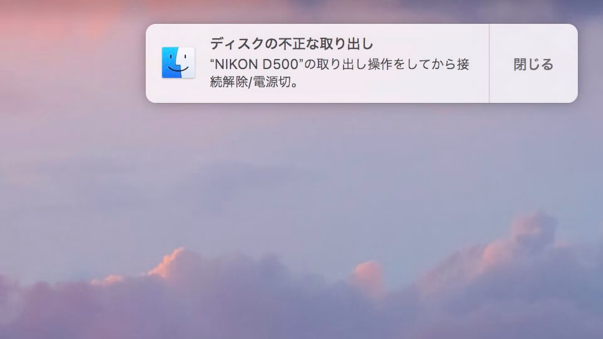USBメモリや外付けHDDなんかの外部ディスクの接続を解除するとき、そのまま引っこ抜くとこんな感じで怒られてしまいます。