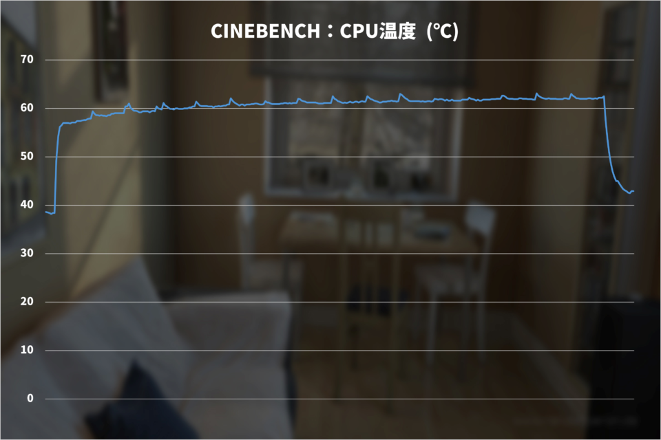 最大温度は63.1℃でした。CPUがTDP 65WのRyzen 7 9700Xなのでだいぶ余裕がありますね。
