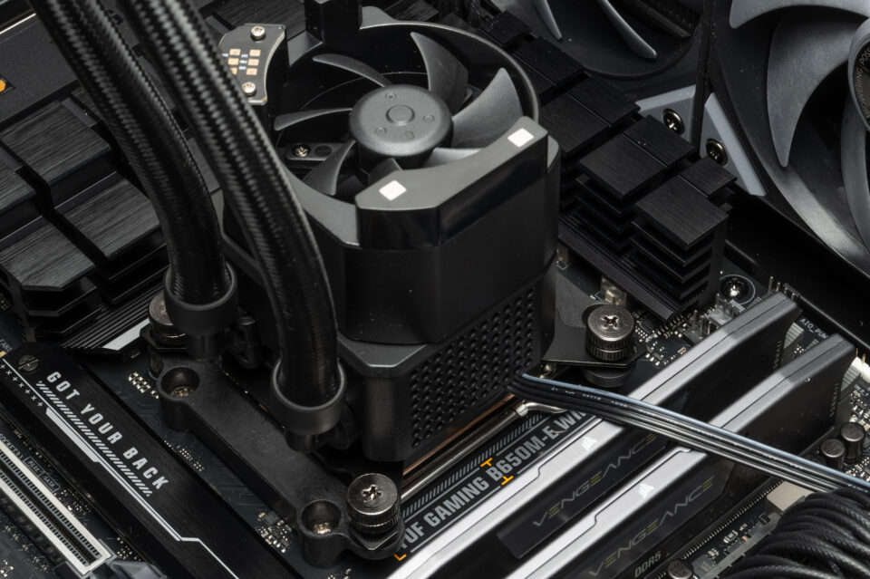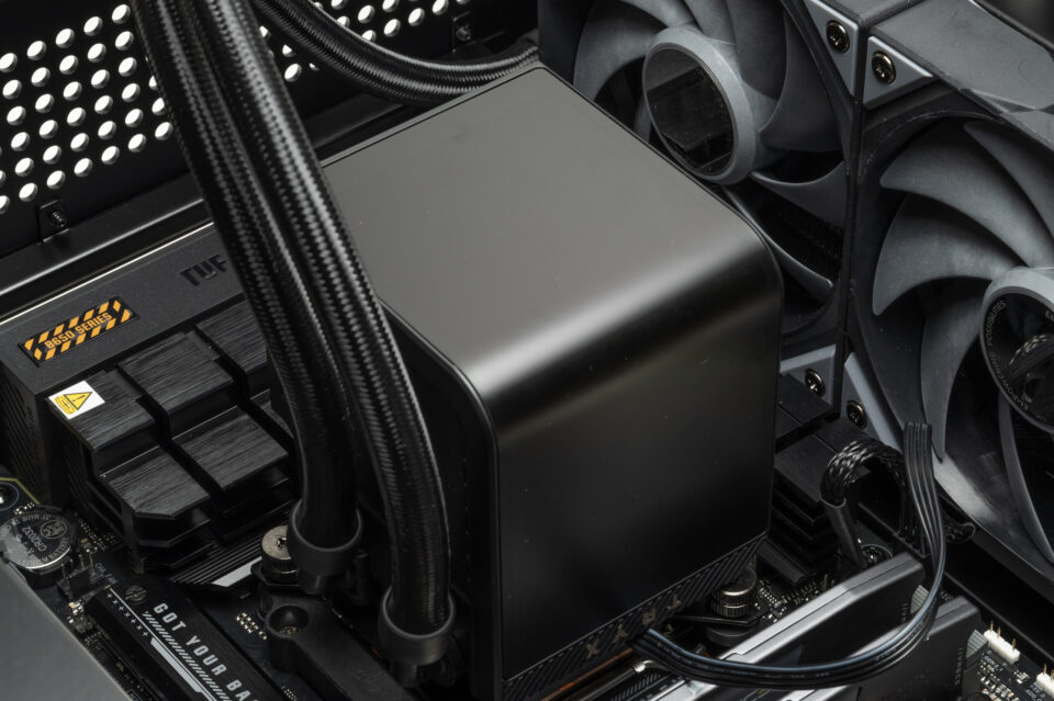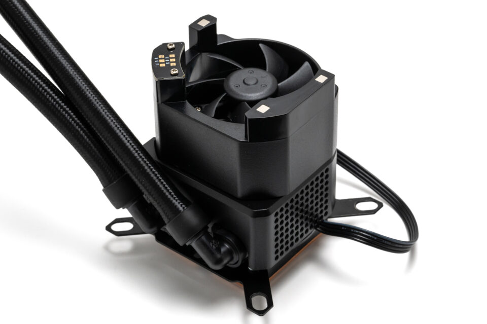 本体部分。ウォーターブロックの上にマザーボードのVRMヒートシンクを冷やすための小型ファンが実装されています。