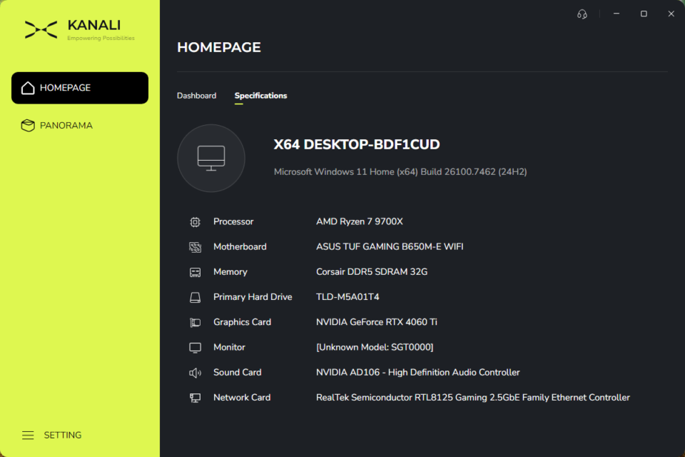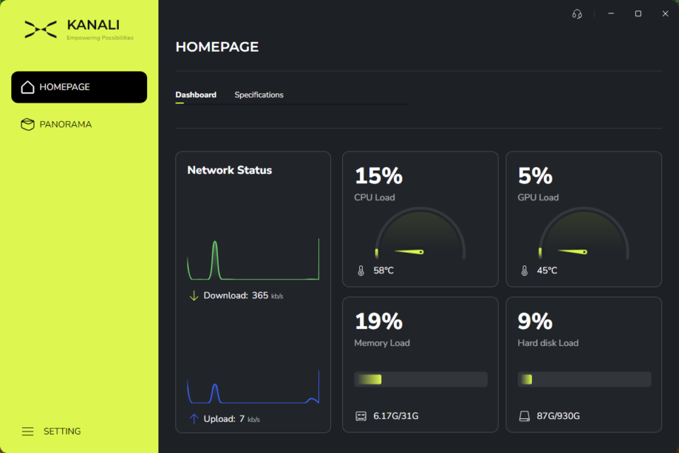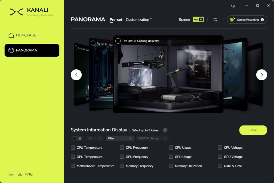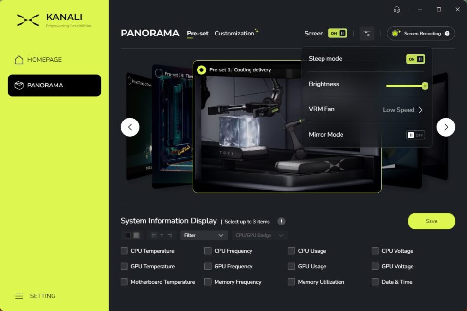 PANORAMAシリーズ向けに提供されている統合ユーティリティ「KANALI」では、ディスプレイの表示内容だけでなく、搭載しているファンの回転数などを制御できます。