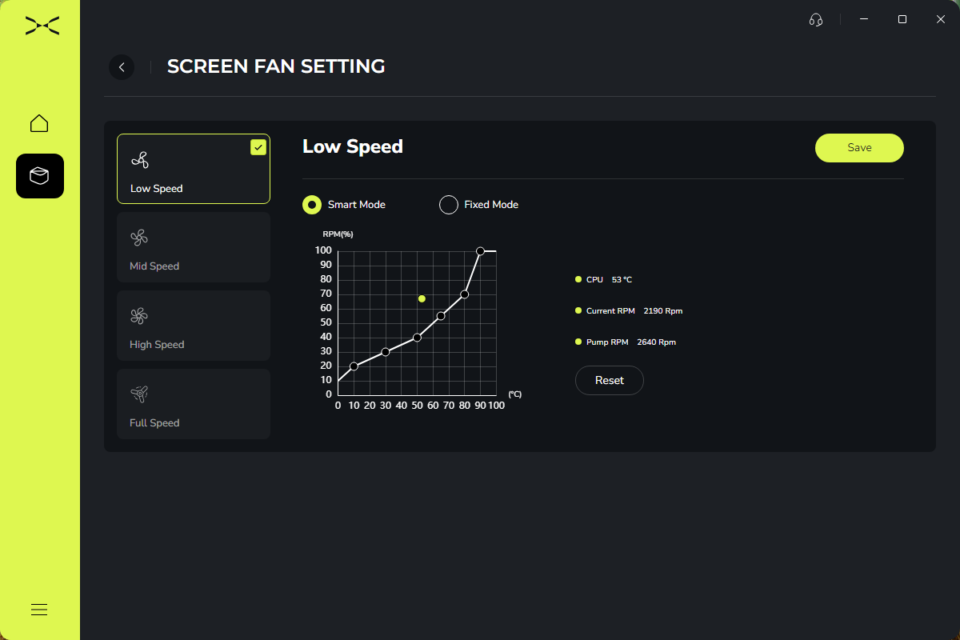VRMファン速度はLow・Mid・High・Fullの4つのパターンから選べます。フルスピードにするとそこそこうるさいです。
