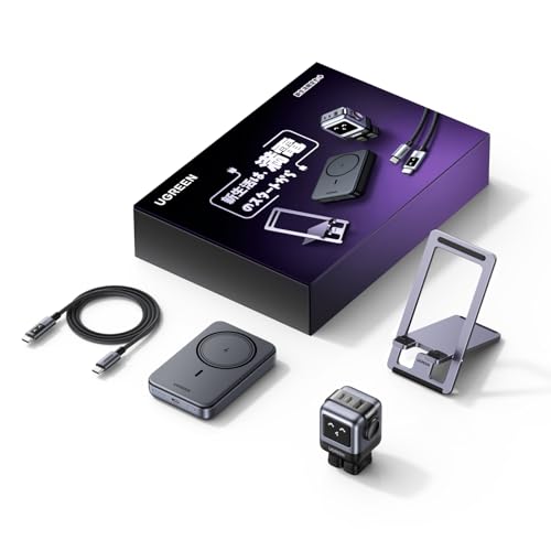 UGREENの充電4点セットをレビューします。65W充電器、10,000mAhワイヤレスモバイルバッテリー、100W USB-Cケーブル、スマホスタンドの4点がひとつの箱にまとまったセット商品です。