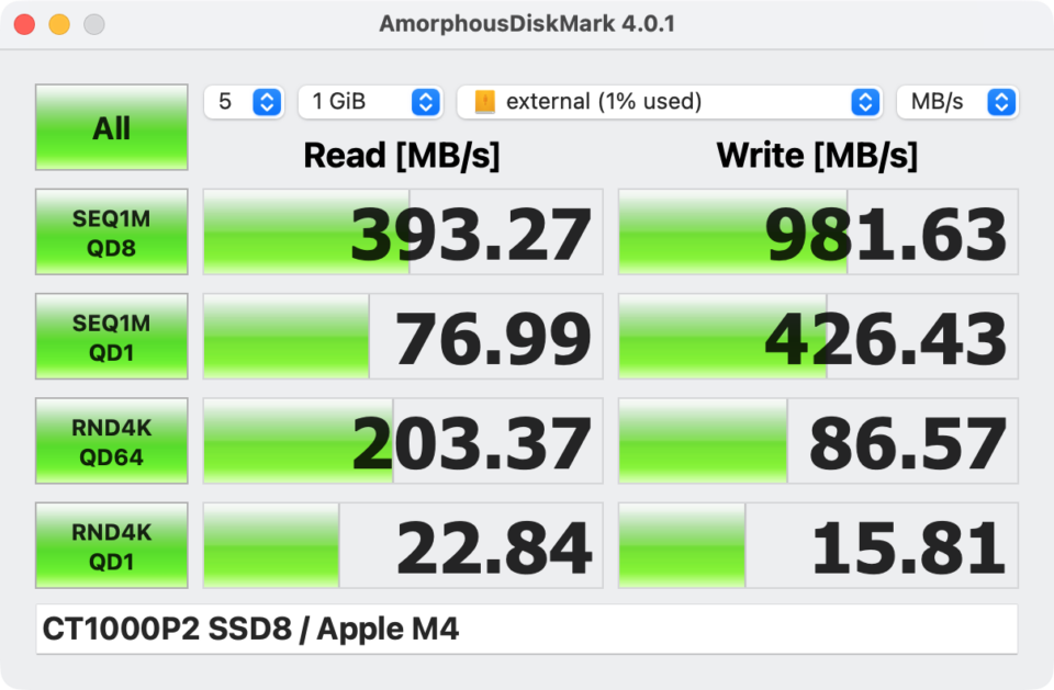 SSDスロットの速度は内蔵SSDほどではなく、実測でリード約400MB/s・ライト約1000MB/sでした。リードが遅いのが気になりますが、仕様上は10Gbps(1250MB/s)出るのでバックアップやデータ保管用としては十分な速度かなと。ケーブルなしで容量増やせることのメリットのほうがデカいです。
