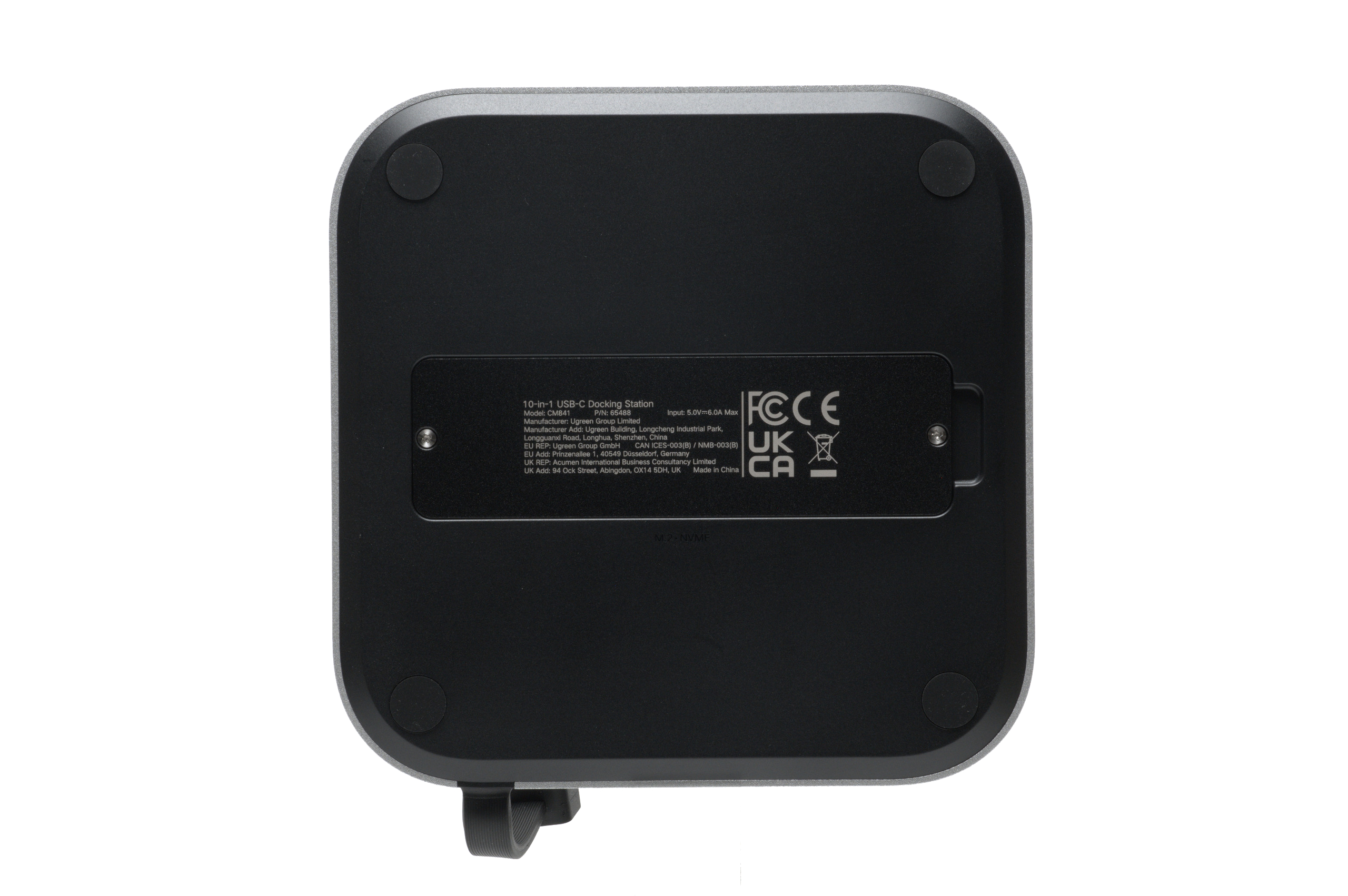 底面。四隅にゴム足があって、デスクの上でもしっかり安定します。中央にはM.2 NVMe SSD用のスロットがあります。