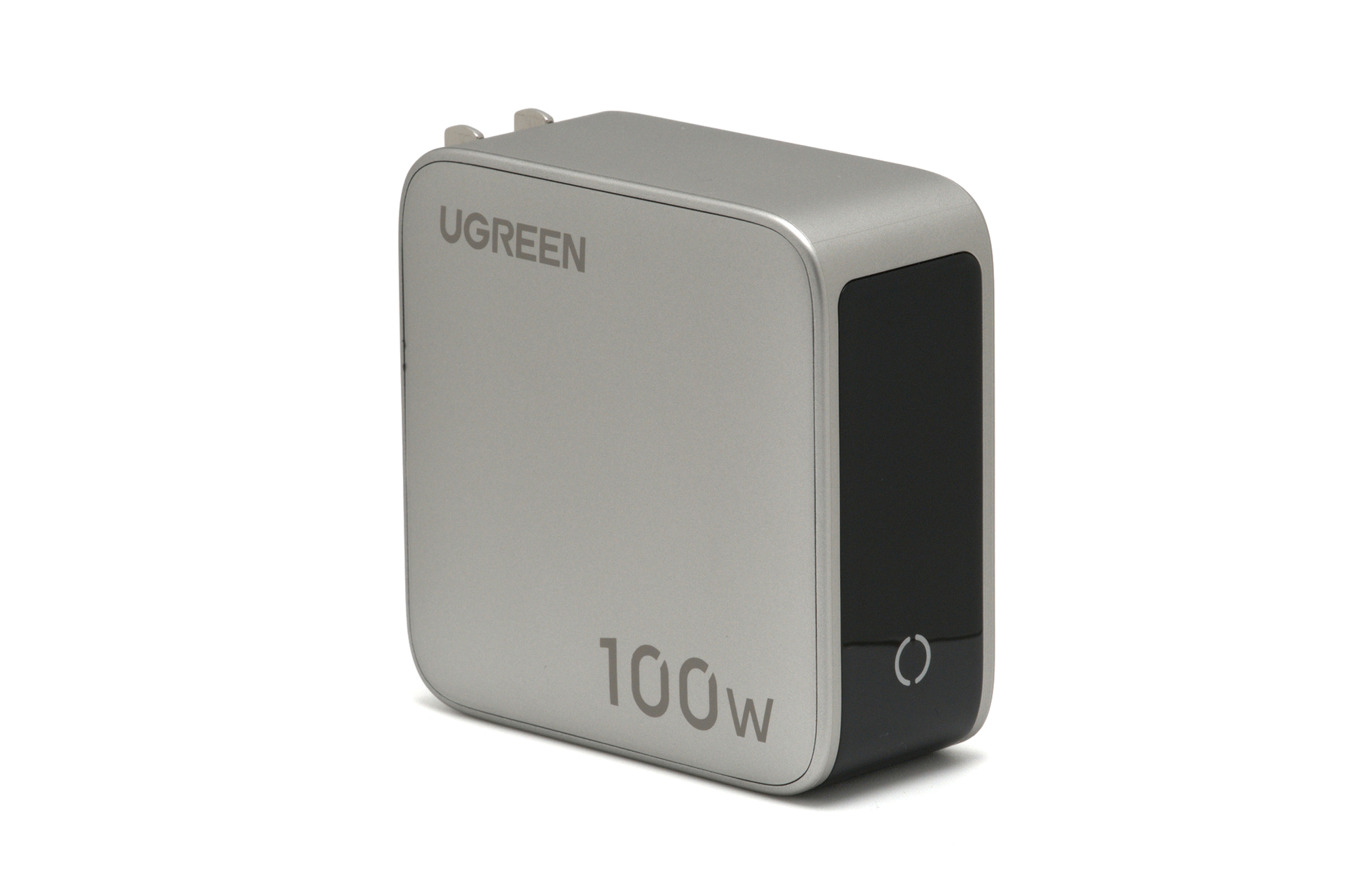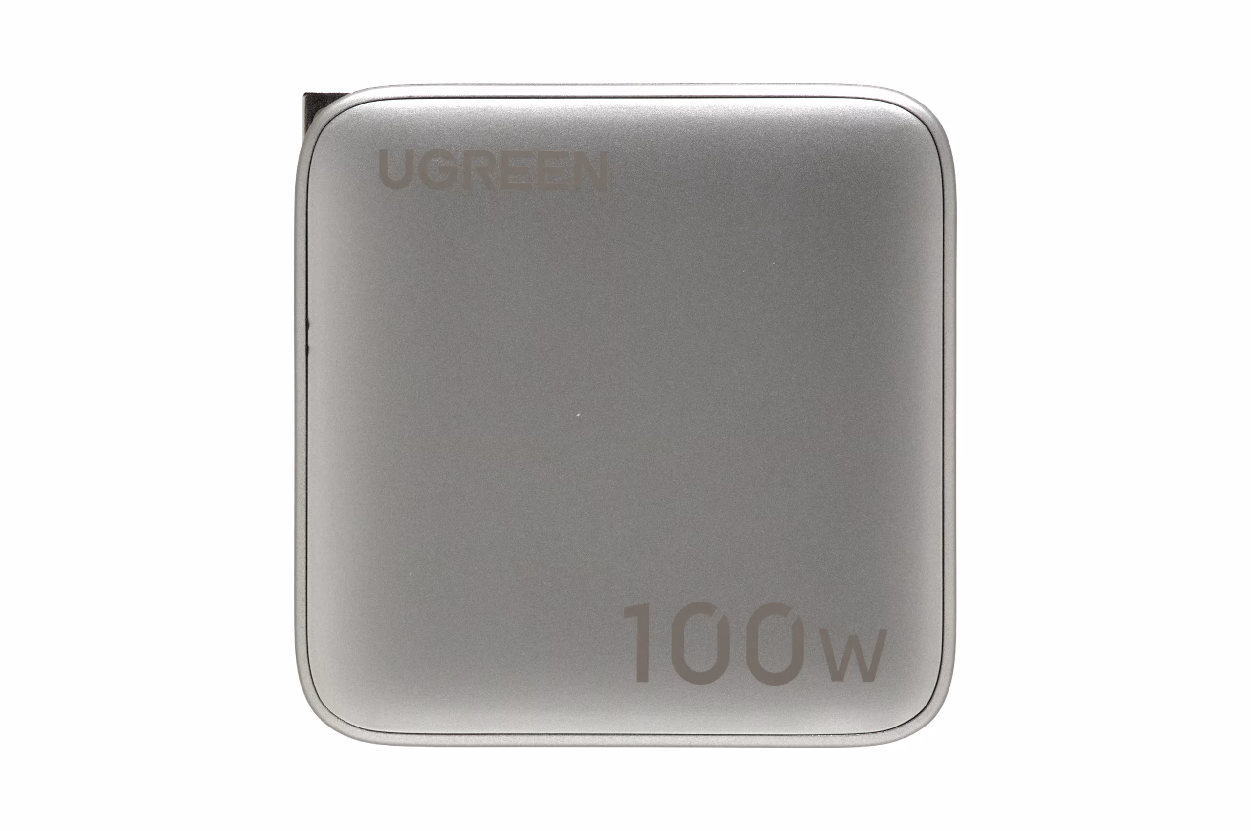 正面。UGREENのロゴと100Wの表記。サイズは実測で75.6×75.6×35.6mmと正方形に近い形状です。