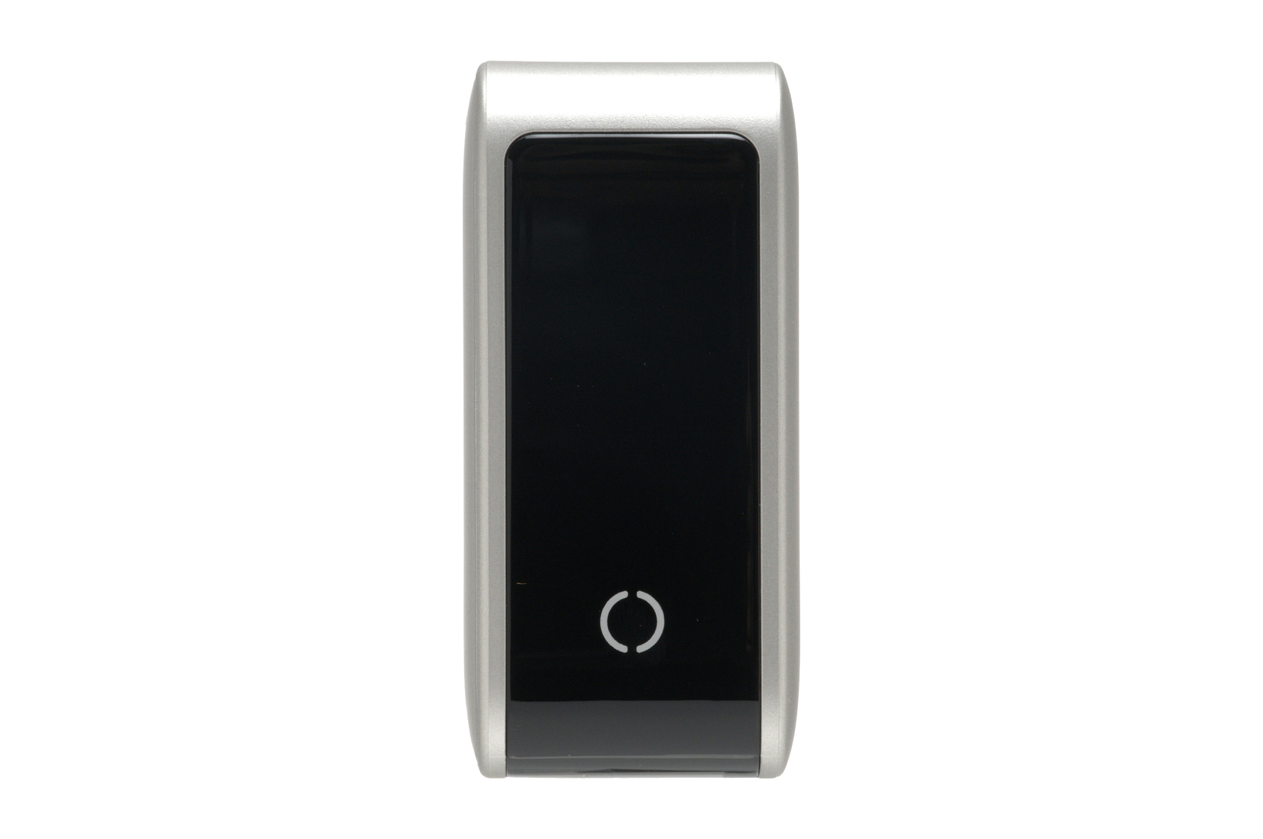 こちらが充電器本体。シルバーのアルミ風ボディに、側面のブラックパネル(ディスプレイ)という組み合わせ。質感は結構しっかりしていて、安っぽさはないですね。