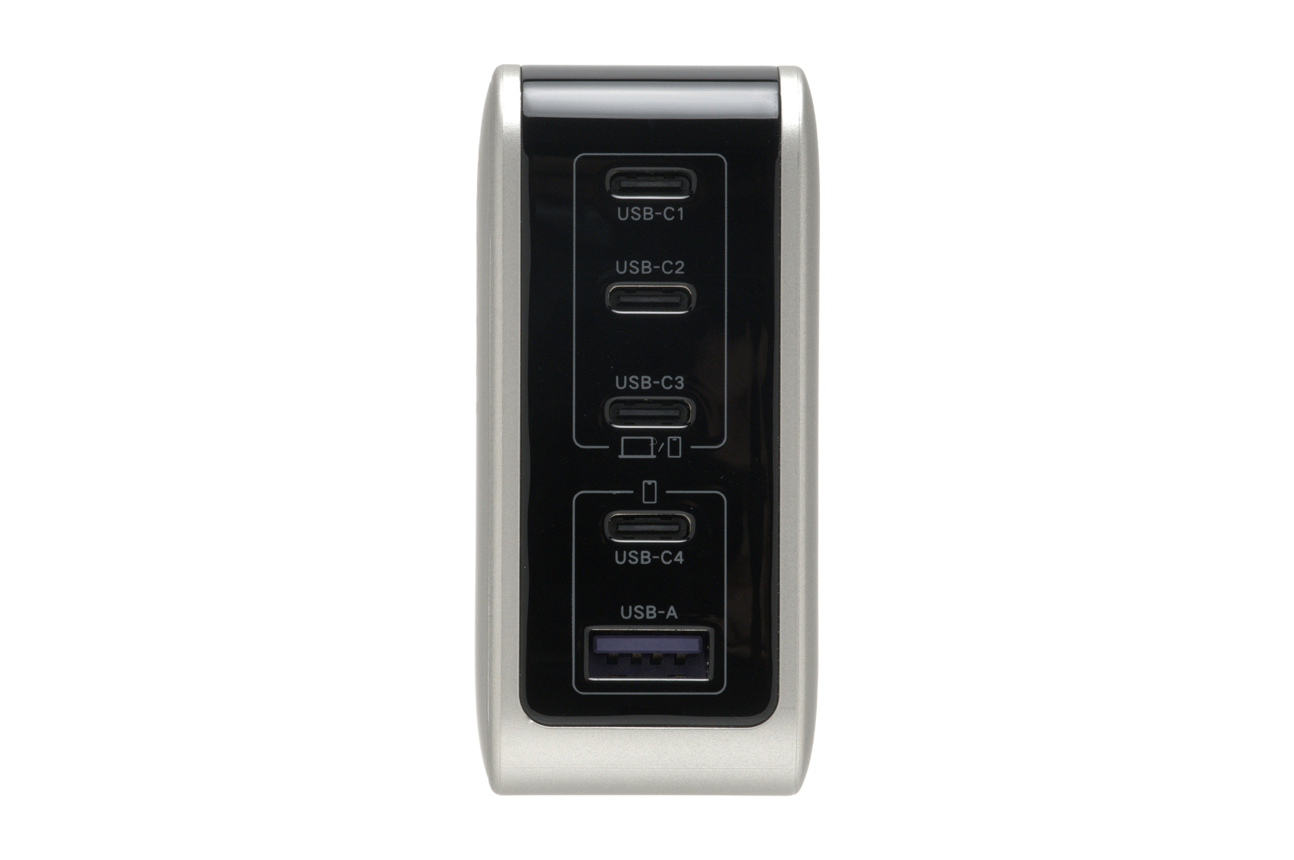 ポート面。上からUSB-C1、C2、C3、C4、USB-Aの5ポート構成。C1〜C3は最大100W、C4は最大30W、USB-Aは最大22.5Wに対応しています。ポート名がそれぞれ印字されているので迷うことはないですね。