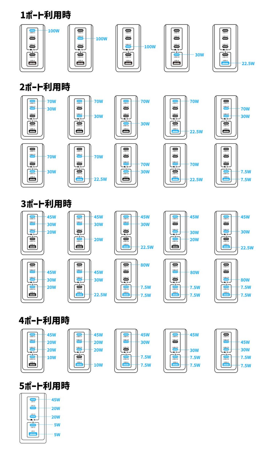 1ポート〜5ポート利用時の電力配分はこんな感じ。