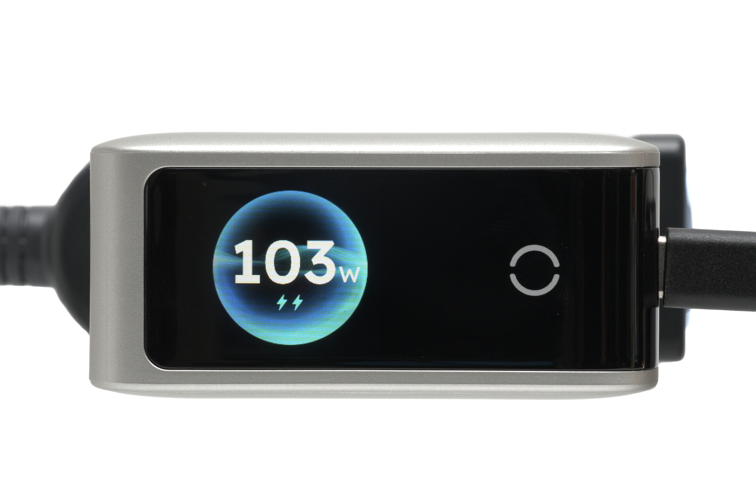 この充電器の最大の特徴がディスプレイ。ケーブルを挿すとアニメーション付きで充電情報がリアルタイム表示されます。